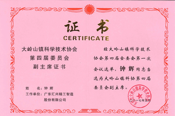 2017年5月18日,大嶺山鎮科學技術協會第四次代表大會在大嶺山鎮隆重召開。大嶺山鎮人民政府副鎮長蔡容穩、教育辦主任黎仲波、婦聯副主席葉小靜、團委副書記李曉君列席會議。市科協副調研員譚德陽處長、學會部蔡裕彬部長兩人列會并指導。科技辦副主任葉偉強主持本次會議。會議選舉產生了新一屆科協領導班子成員,廣東匯興精工智造股份有限公司(股票代碼:839258)董事長鐘輝當選為大嶺山鎮科學技術協會副主席。