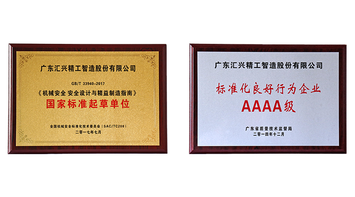 2017年8月30日,經(jīng)廣東省質(zhì)量技術(shù)監(jiān)督局、省標(biāo)準(zhǔn)化協(xié)會專家組的現(xiàn)場評審,廣東匯興精工智造股份有限公司(股票代碼:839258)再度獲評為“AAAA級標(biāo)準(zhǔn)化良好行為企業(yè)”及《機(jī)械安全 安全設(shè)計與精益制造指南》國家標(biāo)準(zhǔn)起草單位,在行業(yè)中到示范引領(lǐng)作用。