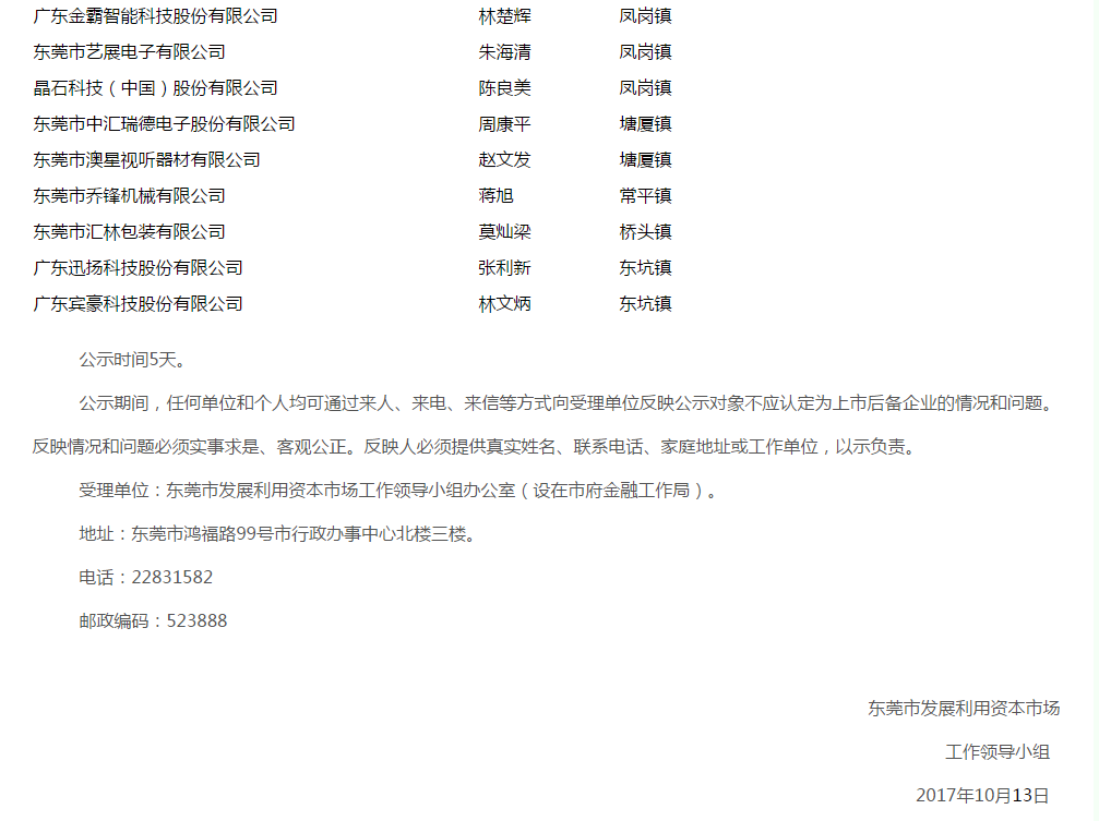 關于認定東莞市第十一批上市后備企業(yè)公示的通告